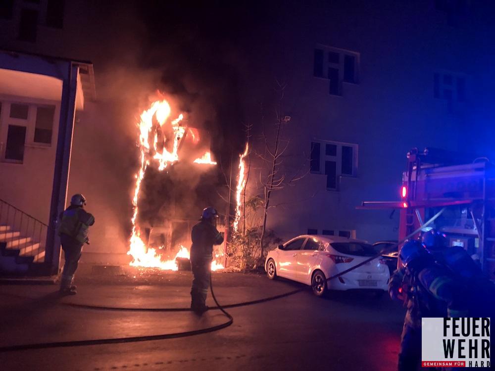 17.11.2019 18:38 f3,r1 Hard Uferstraße Mittelschule Hard Markt Containerbrand – Gebäude bedroht
