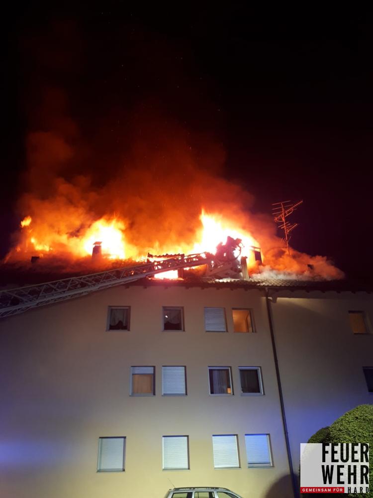 Die Löscharbeiten dauerten bis in die Morgenstunden. Die 11 Mann der Feuerwehr Hard, welche mit der DLK und dem TLF vor Ort waren, konnten den Einsatz um kurz vor 7 Uhr beenden.