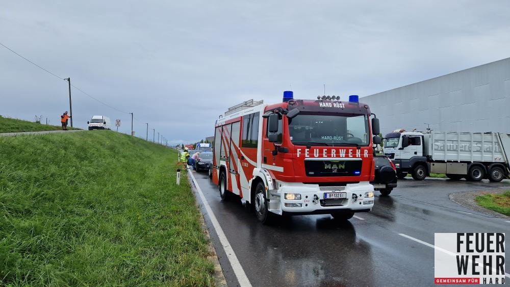 18.9.2023 13:38 t2, r1 FUßACH L203 RHEINSTRAßE – V.U. – Auffahrunfall 3 Fahrzeuge – 1 verl. Person – Betriebsstoffe rinnen aus