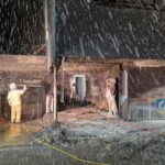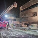 Nachdem der Brand gelöscht war, wurden beschädigte Jalousien, geborstene Fenster und Fassadenteile im ersten OG entfernt, damit diese nicht herunterfallen können.