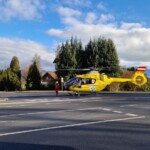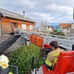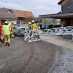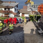 Bereits 10 Minuten nach Eingang des Alarms, waren wir vor Ort und begannen mit den Vorbereitungen für eine Rettung aus dem 1. Obergeschoss. Auf Anweisung des Notarztes wurde zwischenzeitlich ein Hubschrauber alarmiert, welcher den Patienten in eine Spezialklinik fliegen sollte. Deshalb wurde durch die Mannschaft des Rüstlöschfahrzeugs eine Straßensperre errichtet, damit eine problemlose Landung möglich war.