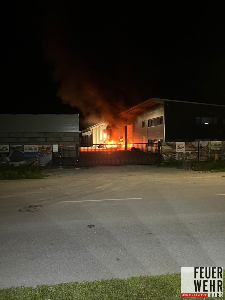 Lage am Einsatzort: Auf Anhänger abgestellter E-Buggy in Vollbrand. Brand droht auf Gebäude überzugreifen