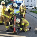 Nachdem die Drehleiter in Stellung gebracht war, mussten Absperrpfosten, die eine Durchfahrt mit dem Rettungswagen verhinderten, mit einem Winkelschleifer entfernt werden.