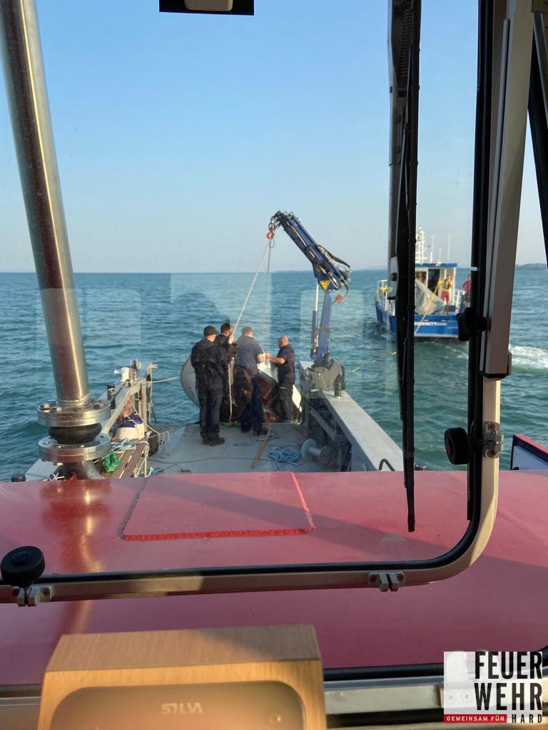 Das gesunkene Boot war bereits gesichert und wurde anschließend durch uns aus dem Wasser gehoben. Da durch das Auflaufen ein Loch in den Rumpf gerissen wurde, musste das havarierte Boot auf der Ladefläche des Feuerwehrboots zur nächsten Werft befördert werden.