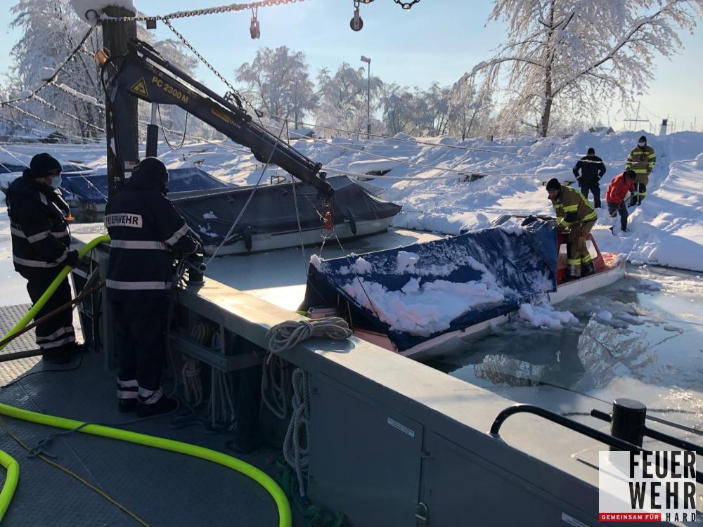 Die Schneemengen der letzten Tage, hatten zur Folge, dass auch einige Boote mit dem zusätzlichen Gewicht zu kämpfen hatten. Eines davon sank so weit im Wasser ein, dass es volllief und im Heckbereich komplett unter Wasser war.