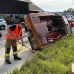 Durch mangelnde Ladungssicherung, war ein Boot von einem Anhänger gefallen. Die austretenden Betriebsstoffe mussten mit Bindemittel aufgenommen und das Boot mit einem Kran wieder auf den Hänger gehoben werden.