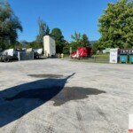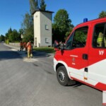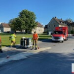 6 Mann waren mit HARD LAST 2 im Einsatz um die Dieselspur auf der Straße mit Bindemittel zu beseitigen. Außerdem musste eine Fremdfirma damit beauftragt werden, das kontaminierte Erdreich auf dem Parkplatz abzutragen.