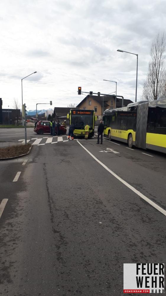 23.12.2020 10:38 t1, r3 HARD RHEINSTRAßE # Landstraße Linienbus gegen PKW – Aufräumarbeiten nach VU