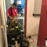 Noch während wir mit dem Abpumpen des Wassers beschäftigt waren, alarmierte uns die RFL zu einem weiteren Einsatz. Bei einem Lebensmittelhersteller stand der gesamte Keller mehrere Zentimeter hoch unter Wasser.