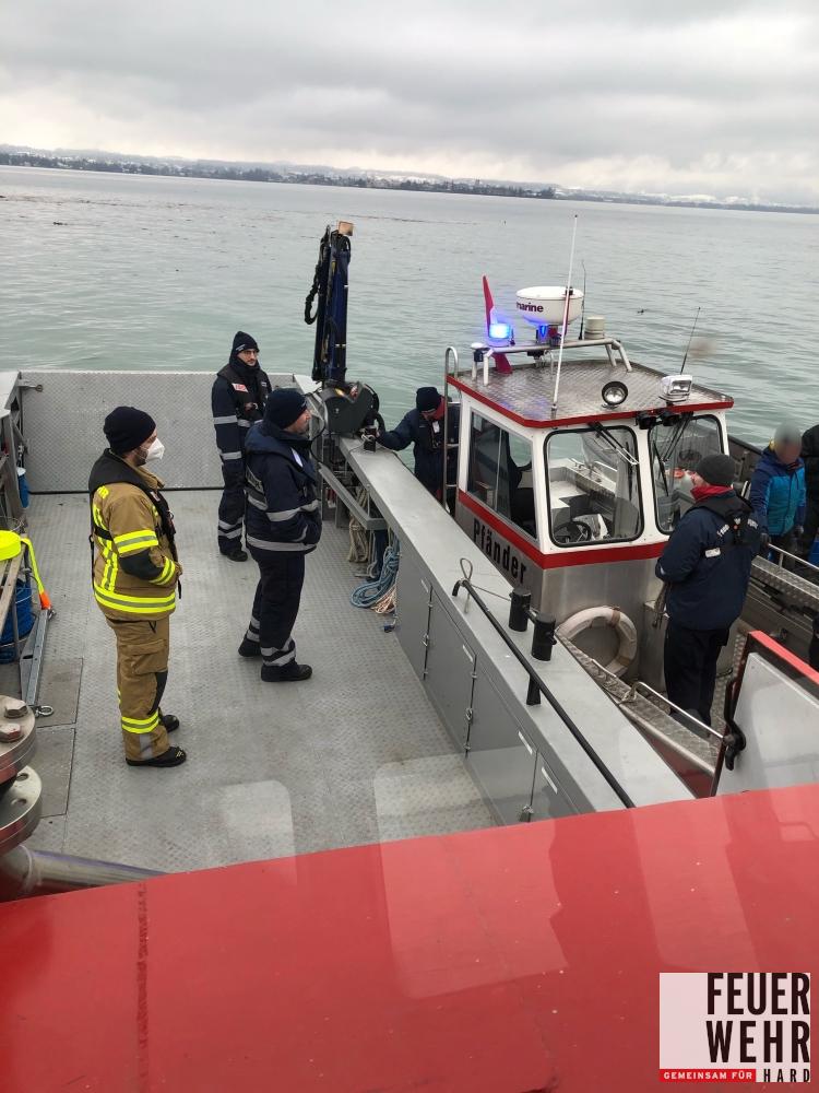 Deshalb rückten 5 Mann mit dem Arbeitsboot „Föhn“ zur Einsatzstelle aus um die Lage zu sichten.