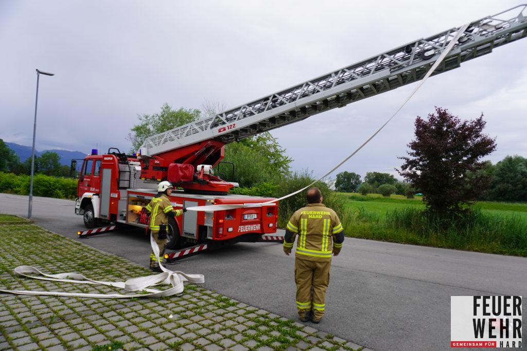 Bei der letzten Gruppenübung, welche am Montag stattfand, war die Ausbildung der Löschgruppe mit Einbeziehung der Drehleiter im Mittelpunkt. Mit Hard Tank und der DLK 23-12 bewegten sich einige Kameraden auf ein nahe gelegenes Firmengelände, wo ein Hydrant als Wasserbezug zur Verfügung stand. Nach dem die Löschwasserversorgung zu Hard Tank aufgebaut wurde, konnte die Zubringerleitung zur mittlerweile einsatzbereiten Drehleiter errichtet werden. Danach wurden die verschiedenen Löscharmaturen (Wasserwerfer 1.200 l/min, Löschmonitor 2.400 l/min) auf dem Drehleiterkorb installiert und in Betrieb genommen.