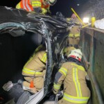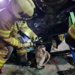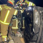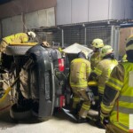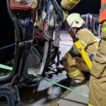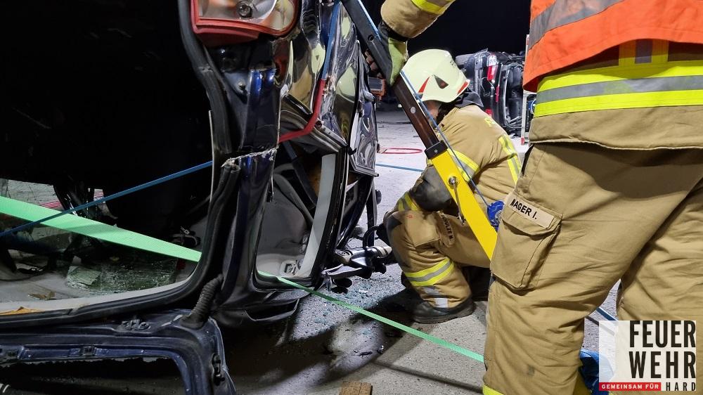 Beim zweiten Szenario wurde ein PKW in Seitenlage angetroffen. Auch hier war der Beifahrer schwer eingeklemmt. Das eingedrückte Dach wurde mit einem Rettungszylinder in die ursprüngliche Position gebracht, damit sich ein Feuerwehrmann um die Person im Fahrzeug kümmern konnte. Anschließend wurde das Dach entfernt und die Person mit dem Spineboard gerettet.